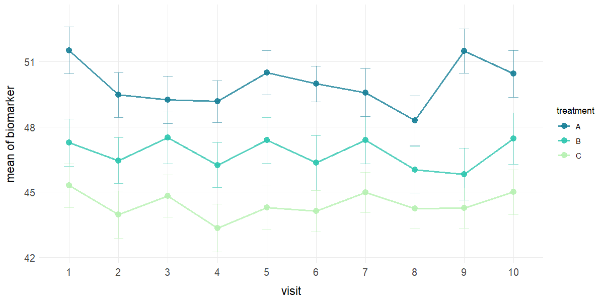 plot_line(data = clinical_df_full, x = "visit", y = "biomarker", group = "treatment",